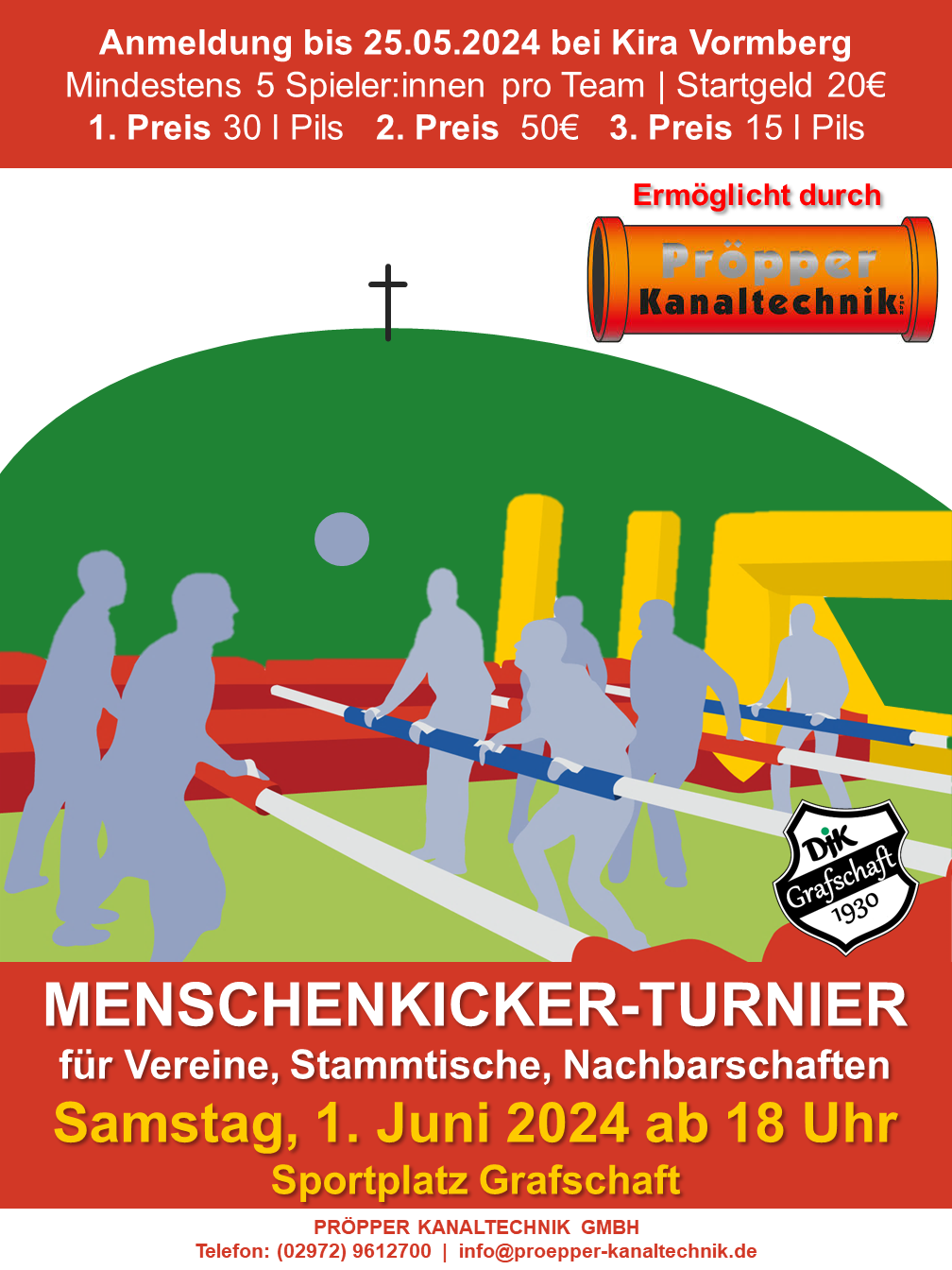 Im Rahmen unseres Sportfests wird es nach zwei Jahren Pause wieder ein Menschenkicker-Turnier geben. Schart mindestens 5 Spieler:innen zusammen und meldet Euch bei Kira (+49 1516 1426692) oder per Mail (fcfg_jugend@outlook.de) an.