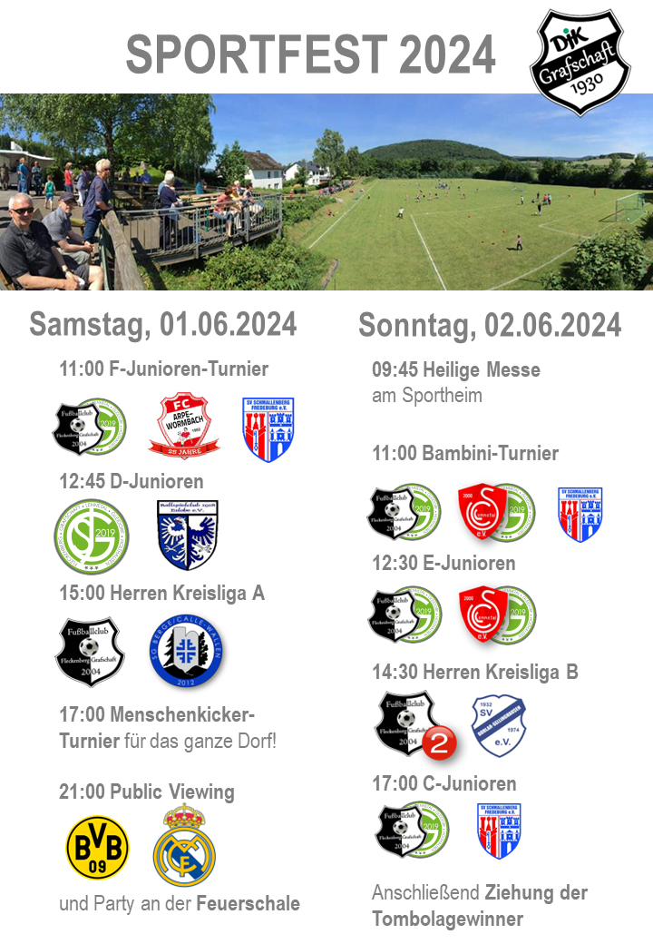 Wir haben wieder ein buntes Sportfest-Programm für Euch zusammengestellt. Nach einigen Jahren Pause könnt Ihr auch selbst wieder aktiv werden beim Menschenkicker-Turnier. Viele interessante Paarungen, lauschige Abende an der Feuerschale und am Samstag auch die Möglichkeit das Champions-League-Finale zu schauen. Am Sonntag findet die heilige Messe am Sportheim statt!