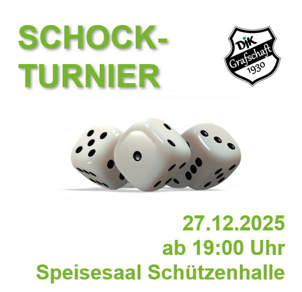 Bitte plant Euch schon mal den 27. Dezember ein. Wegen des großen Andrangs beim letzten Mal verlegen wir das Schockturnier in den Speisesaal der Schützenhalle! Auch dort ist die Teilnehmerzahl begrenzt – Anmeldungen am besten zeitnah bei Lukas Heimes…